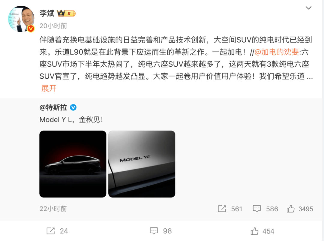 本次特斯拉官方在几乎没有任何预告的情况下突然官宣Model Y L无疑是个好信号,不少网友甚至表示,Model Y L的出现打得大家措手不及。值得一提的是,特斯拉宣布Model Y L即将发布之后,理想汽车CEO李想以及蔚来汽车CEO李斌均转发了这则博文并发文。