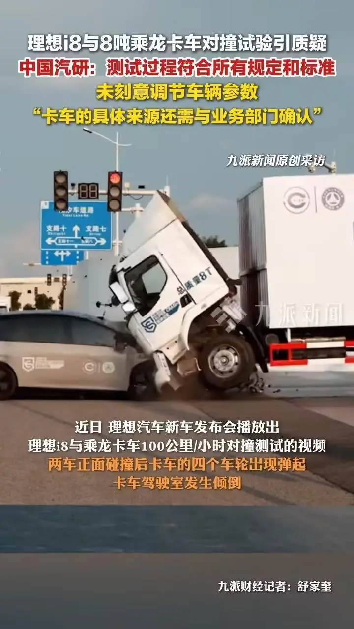 中国汽研回应理想i8对撞乘龙卡车争议:测试全过程符合所有规定和标准,未调整卡车任何参数