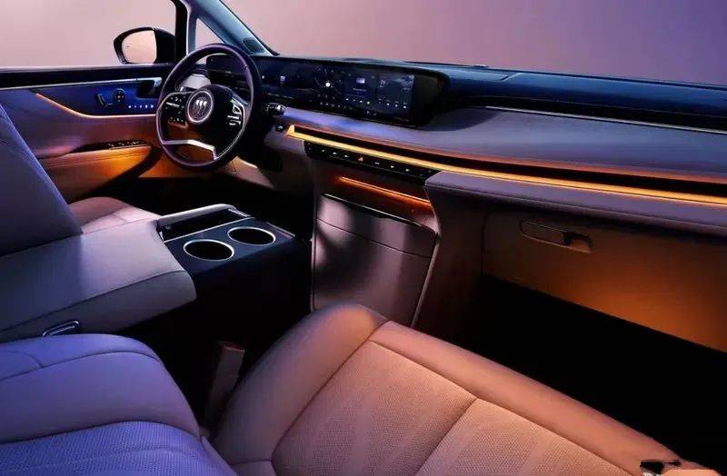 内饰方面,很豪华,多幅式方向盘,采用怀挡式设计,采用配备一体式屏幕,集合了全液晶仪表盘和中控屏,整个中控台是很简约,配备氛围灯,主副驾是打通;在座椅的用料上也是使用高档材料。