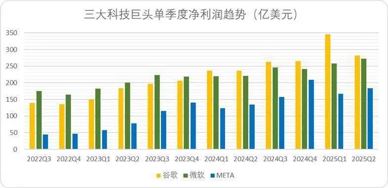 同时,三者利润侧也有不俗的表现:谷歌录得282亿,同比增长19%;微软录得272亿,同比增长了24%;meta录得183亿,增速更是达到了38%。
