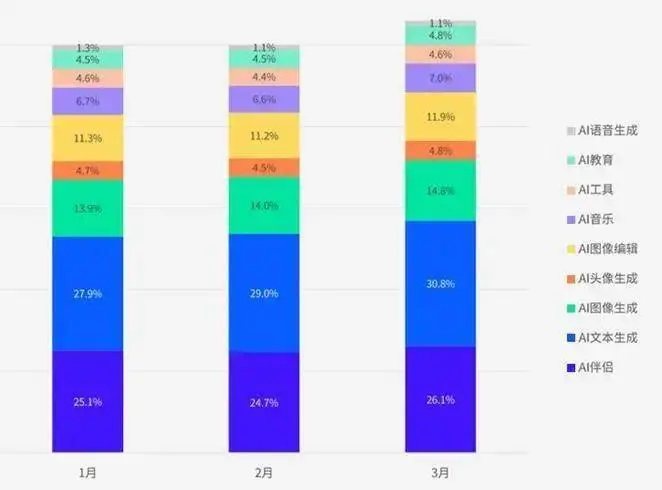 以Appgrowing发布的报告来看,今年第一个季度,海外AI应用的投放增长明显,仅以3月为例,环比增速达到了5%,细分品类来看,绝大多数增速都不错,AI伴侣、文本生成、AI教育的投放数量也明显增长。