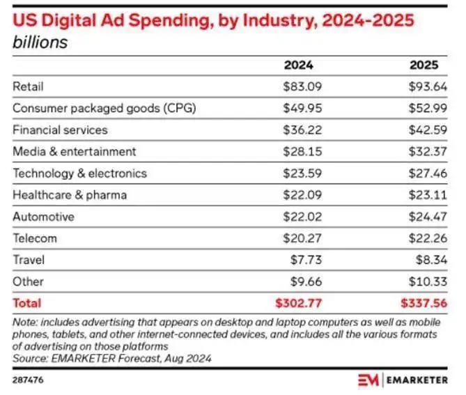根据eMarketer去年的预测来看,目前数字媒体投流中,零售行业断崖式领先,并且今年以来的增速尤为明显。