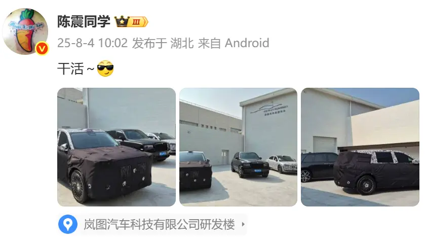 此次新车曝光的源头,源于车评人陈震在武汉岚图研发楼拍摄的一组照片,画面中劳斯莱斯库里南、岚图新款追光(即追光L)与代号“泰山”的全新全尺寸SUV同框,瞬间引发车圈热议。