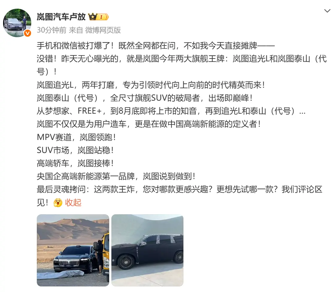 8月5日,岚图汽车科技有限公司CEO卢放在社交媒体上回应称,此前无心曝光的新车已被网友拍到,而这些车型正是岚图今年的两大旗舰王牌——岚图追光L和岚图泰山(目前名称为代号)。