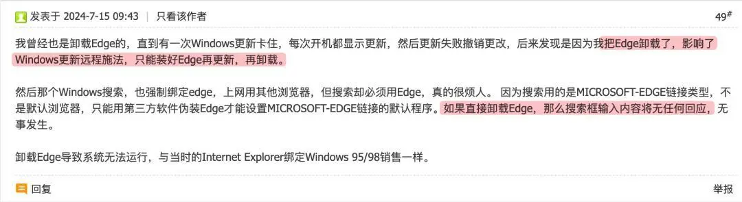 有网友卸载了 Edge,结果 Windows 搜索这个系统级功能直接不让用了,输入内容不会有任何回应,甚至还会卡系统更新。