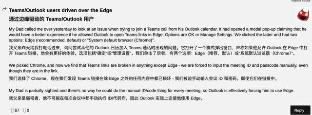一位外国网友的父亲从 Outlook (微软邮箱 App)加入 Teams 会议链接( 微软办公 App )时,弹出一个窗口:允许用 Edge 打开,体验会更好。