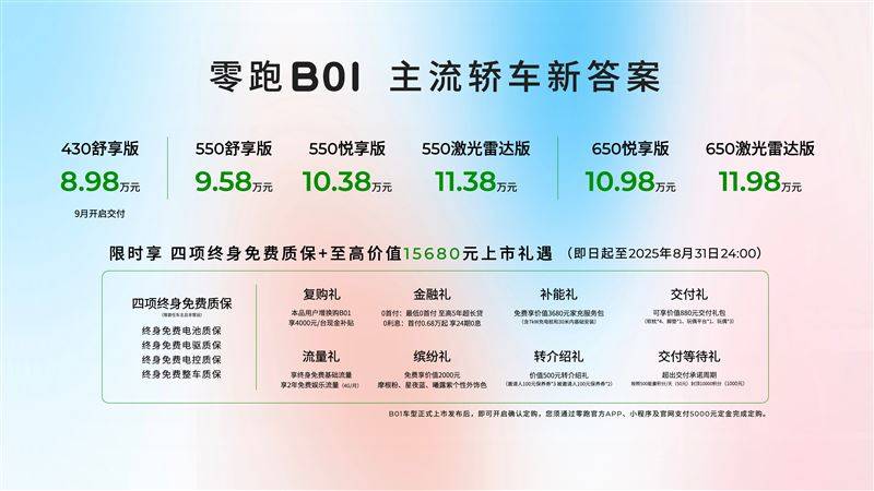 近两年零跑汽车在SUV市场持续发力,推出多款全新车型并且取得了不小的成功,而在轿车领域,继中大型轿车零跑C01之后、零跑又发布了全新紧凑型轿车B01。作为零跑B平台下首款纯电轿车,零跑B01基于LEAP 3.5电子电气架构打造,与前不久发布的紧凑型SUV零跑B10同宗同源。
