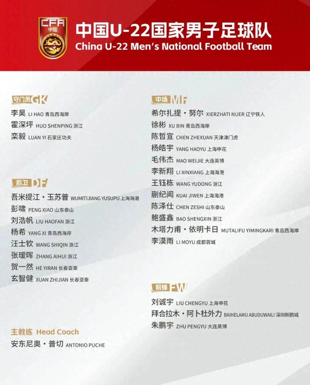 新一期U22国家男子足球队大名单