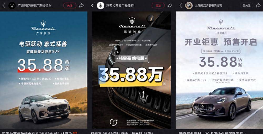 多地玛莎拉蒂门店社交媒体发布海报:Grecale Folgore售价35.88万起。销售顾问透露,这是裸车价,加上必要选配,最终落地约40万元。