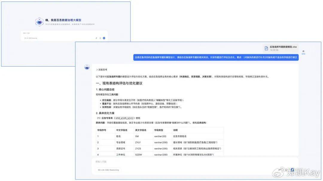 在模型架构上,百思大模型提出“知识+推理”双轮驱动,构建了覆盖数据治理全生命周期的智能能力体系。模型将复杂的数据治理知识体系解构为可计算、可组合的“知识原语”,通过语义单元的组合与推理,实现对治理任务的深度理解与规划。这使百思大模型不仅能够回答具体的治理问题,也能进行多步骤逻辑推理,生成结构化的治理方案。