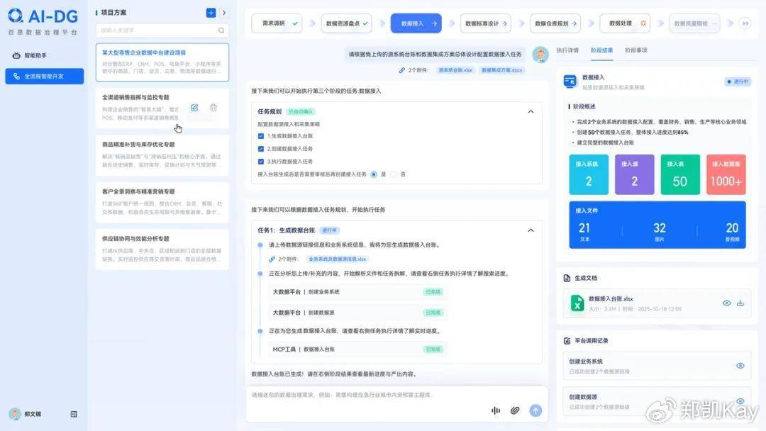 作为百思大模型深度协同伙伴的百思数据治理平台(AI-DG),它是百分点科技最新发布的新一代AI原生治理平台,承担着从“智能决策”到“高效执行”的关键使命。大模型作为“决策引擎”负责知识赋能与智能规划,而AI-DG作为“执行引擎”通过多智能体协同实现规划落地。这种双引擎架构彻底改变了传统治理模式中决策与执行脱节的痛点。平台内置的多领域专业智能体,覆盖数据接入、标准制定、质量检测、资产编目等数据治理全流程任务,能够根据大模型生成的方案自动调度执行,形成完整闭环。
