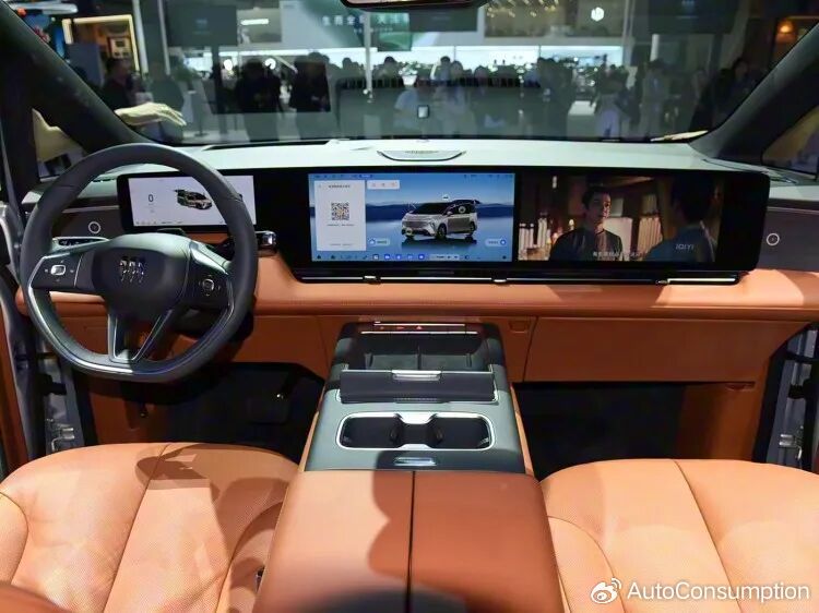 内饰也焕然一新,首次搭载的三屏贯通式娱乐屏,包括10.25英寸的全液晶表盘+16.3英寸中控屏+16.3英寸副驾屏,配合50英寸全景AR-HUD抬头显示、21英寸二排吸顶屏,二排两个5.5英寸智慧移动管家屏,带来极具科技感的视觉效果。