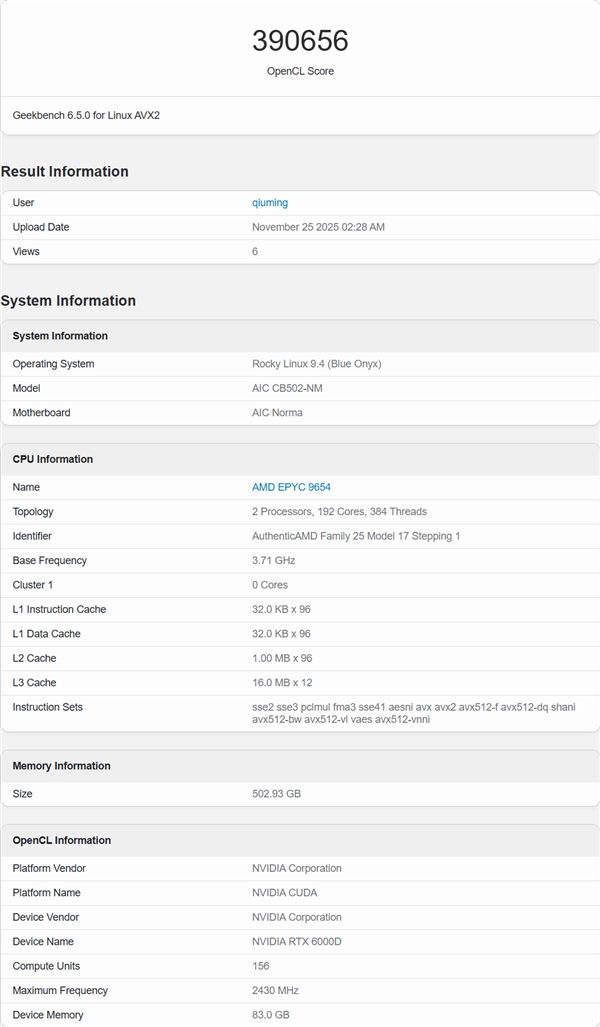 在Geekbench 6的OpenCL基准测试中,NVIDIA RTX 6000D获得了390,656分,这一成绩明显低于全规格版本约450,000至500,000分的水平。