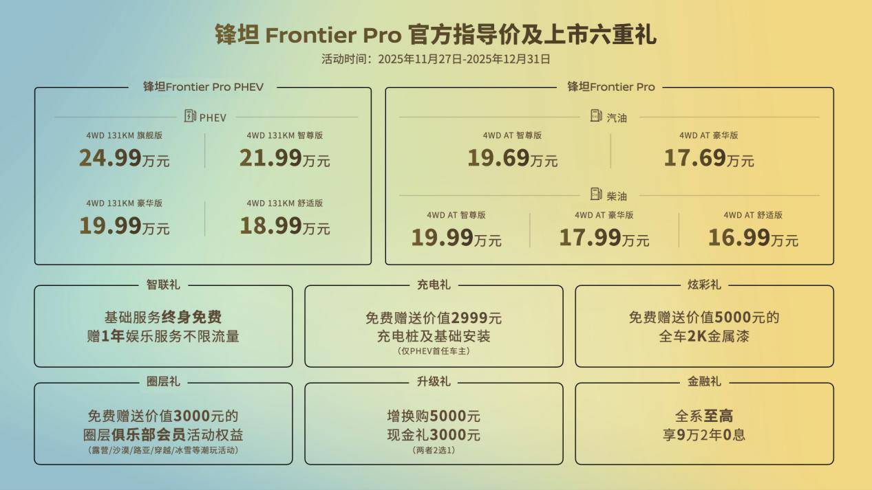 11月27日,郑州日产在郑州国际会展中心举办锋坦Frontier Pro全球首发活动。这是日产全球皮卡车型首次在中国首发上市,新车全系标配四驱系统,提供燃油版(2.0T汽油、2.3T柴油)与1.5T插混三种动力选择,其中燃油版锋坦Frontier Pro售价为16.99万-19.99万元,锋坦Frontier Pro PHEV售价为18.99万-24.99万元。活动现场,官方还同步推出包含智联礼、充电礼等在内的六重购车礼遇。