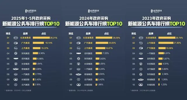 日前太平洋汽车制作了2023年、2024年和2025年1—5月新能源公务车采购排行榜TOP10,数据显示,在采购的新能源公务用车中,比亚迪遥遥领先,比例分别达到了29.76%、26.09%和28.21%,而且在前三强品牌中,比亚迪是唯一一家民营汽车品牌,这其中的含金量,大家应该可以明白。