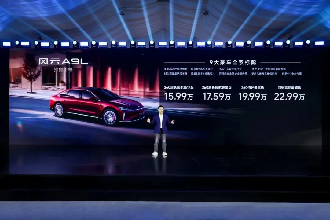 2025 年 6 月 26 日,奇瑞风云序列扛鼎之作风云 A9L 正式开启预售,预售价格 15.99-22.99 万元,推出 260 超长续航豪华版、260 超长续航尊贵版、260 伯牙奢享版、四驱高能巅峰版四款配置车型。预售期间至高享价值 4 万元权益,包括贷款购车 10 万 3 年 0 息的金融礼、全系置换 10000 元厂家补贴的置换礼、限时免费赠送价值 6000 元高定车漆(车厘子红 / 星瀚银 / 玄武灰三选一)的生态礼,以及 260 伯牙奢享版限时免费获赠价值 10000 元零重力座椅和价值 8000 元 20 吋精工轮毂 + 马牌轮胎的升级礼。