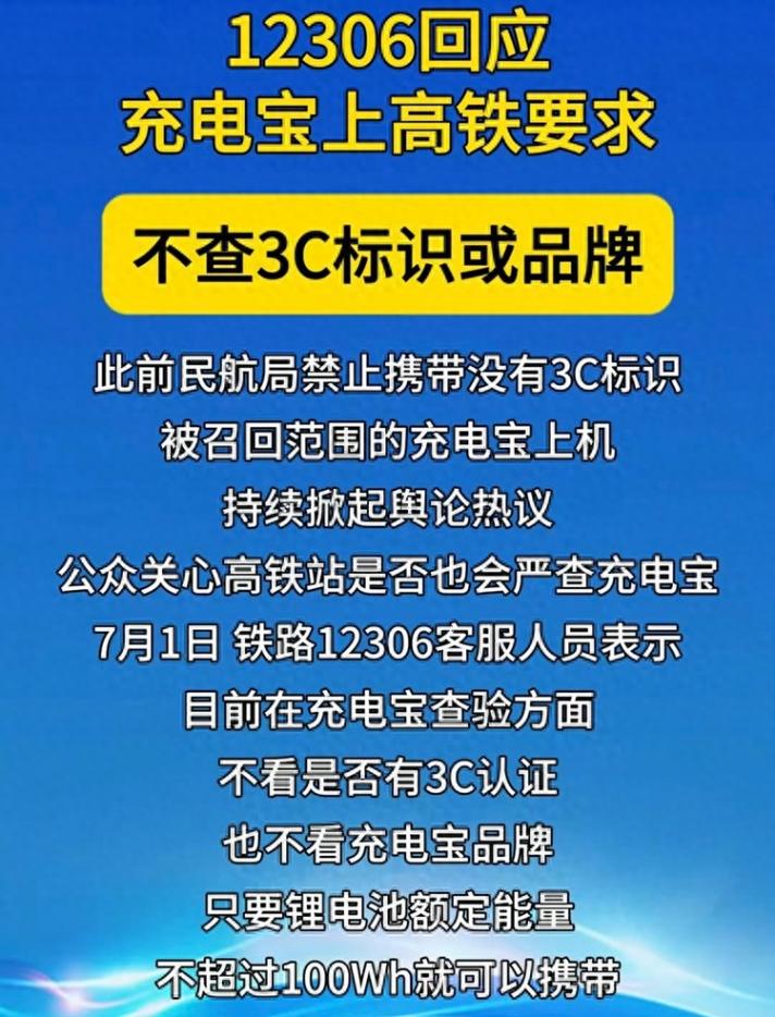 最近12306的客服人员回应了高铁目前对于充电宝能否带上高铁的相关规定。截至目前,高铁对携带充电宝的要求是标志清晰、单块充电宝的额定能量不超过100wh,并不需要查看充电宝品牌以及是否带有3C标识。