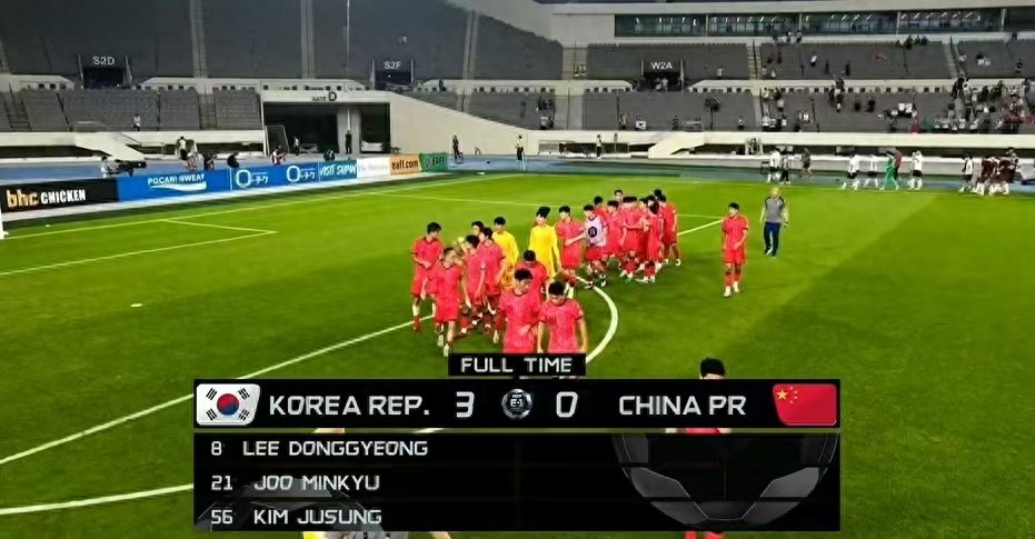 易边再战,国足试图通过换人改变比赛走势,但依然无法限制韩国队的进攻。第57分钟,韩国队获得角球机会,前点头球被颜骏凌扑出后,后点的金朱晟补射破门,将比分锁定为3比0。此后,国足虽由替补登场的韦世豪、塞尔吉尼奥创造了一些得分机会,但均未能转化为进球。全场比赛,韩国队15次射门7次射正3次破门,国足5次射门0次射正0破门 ,控球率方面韩国队也以55%比45%领先国足。