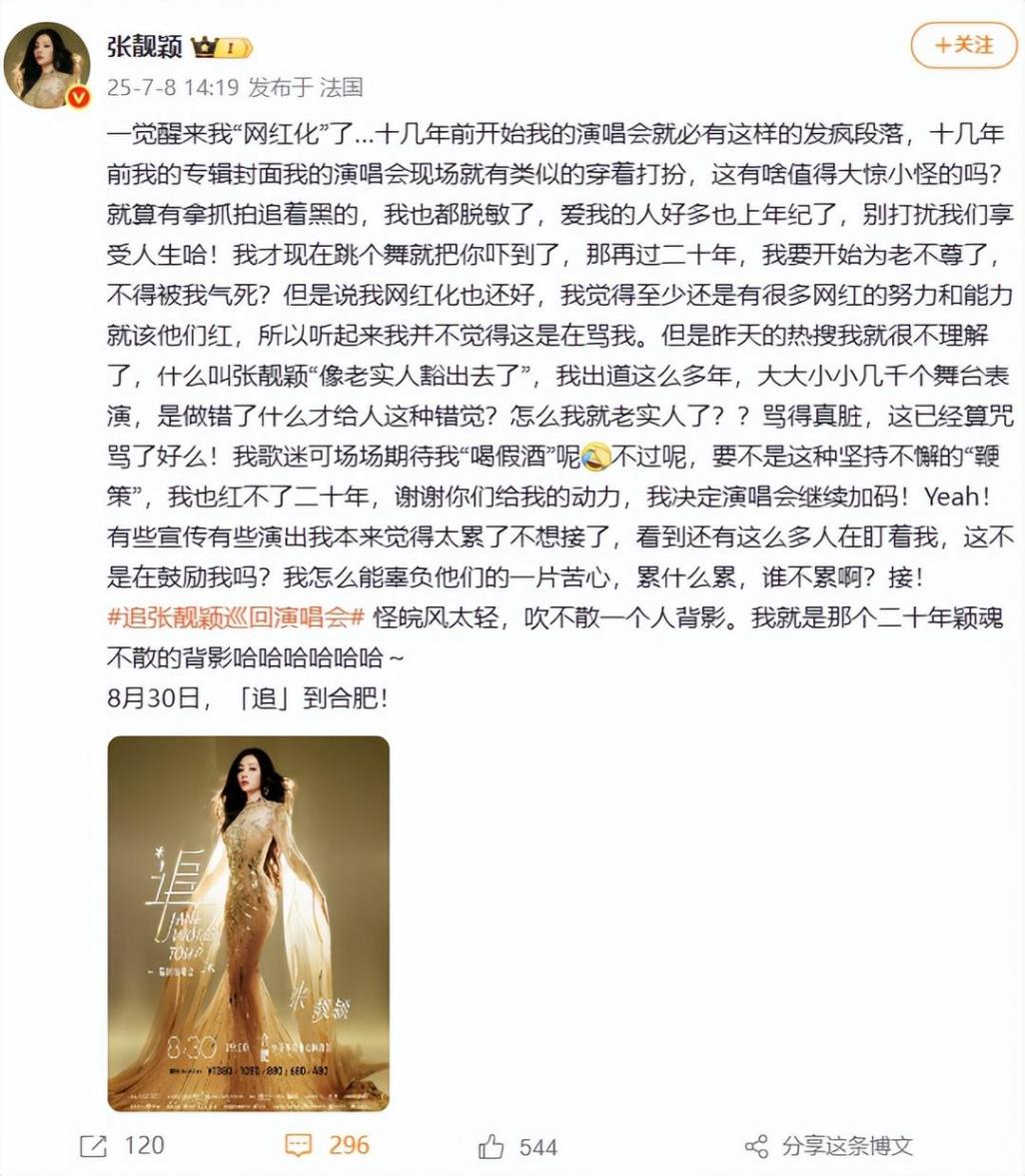 一觉醒来我“网红化”了……十几年前开始我的演唱会就必有这样的发疯段落,十几年前我的专辑封面我的演唱会现场就有类似的穿着打扮,这有啥值得大惊小怪的吗?就算有拿抓拍追着黑的,我也都脱敏了,爱我的人好多也上年纪了,别打扰我们享受人生哈!我才现在跳个舞就把你吓到了,那再过二十年,我要开始为老不尊了,不得被我气死?但是说我网红化也还好,我觉得至少还是有很多网红的努力和能力就该他们红,所以听起来我并不觉得这是在骂我。但是昨天的热搜我就很不理解了,什么叫张靓颖“像老实人豁出去了”,我出道这么多年,大大小小几千个舞台表演,是做错了什么才给人这种错觉?怎么我就老实人了??骂得真脏,这已经算咒骂了好么!我歌迷可场场期待我“喝假酒”呢。不过呢,要不是这种坚持不懈的“鞭策”,我也红不了二十年,谢谢你们给我的动力,我决定演唱会继续加码!Yeah!有些宣传有些演出我本来觉得太累了不想接了,看到还有这么多人在盯着我,这不是在鼓励我吗?我怎么能辜负他们的一片苦心,累什么累,谁不累啊?接!