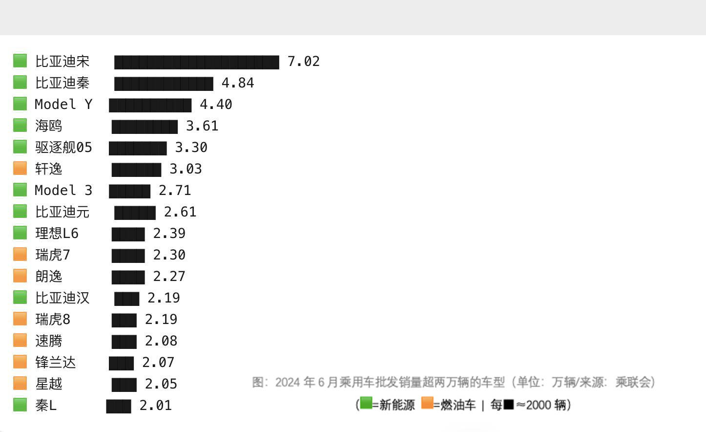 2024年6月,销量破2万辆的车型有17款,其中新能源车型牢牢占据榜单前五,燃油车在主流视野中略显边缘;