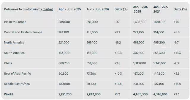 7月9日,大众汽车集团发布2025年上半年交付数据。上半年全球交付441万辆汽车,同比增长1.3%。大众汽车集团 2025 上半年全球交付的纯电动汽车数量同比增长47%,达到465,500辆。其中,欧洲(增长 89%)和美国(增长 24%)增长强劲,中国(下降 34%)发展放缓。