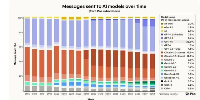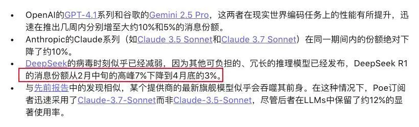 在 AI 模型平台 Poe 的报道上可以看到,在即使是年初最火的时候,DeepSeek 的使用率,也只有大概百分之六七左右。