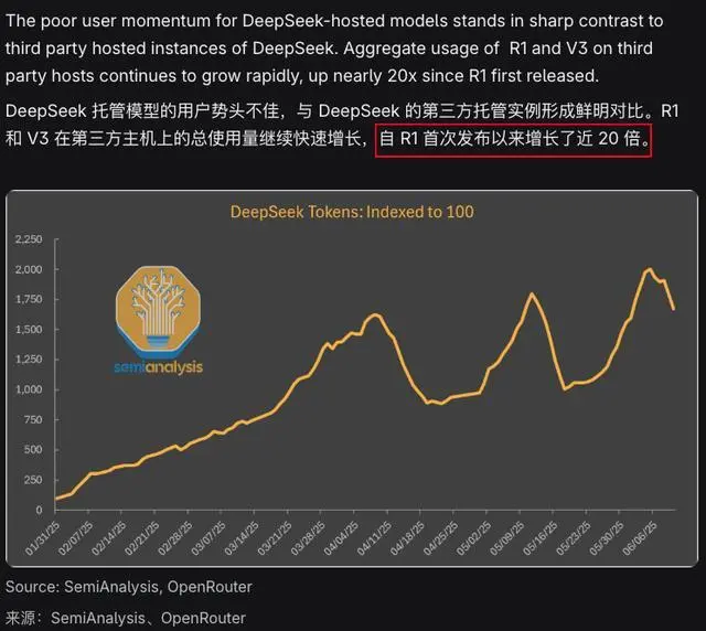 但是可能换到隔壁 OpenRouter 上,就会发现用 DeepSeek 的人一点不少,使用量远高于 10%。