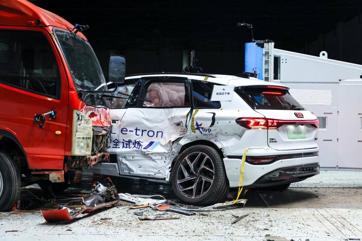 但是紧接着,一辆重达3吨(模拟城市常见物流货车重量)的失控货车,以50km/h的速度从侧面垂直方向撞向Q6L e-tron左侧车身第二排区域。巨大的撞击力瞬间使得车辆发生旋转,右侧第二排位置与刚性柱体(模拟路侧坚固的灯杆)发生碰撞,形成难度极高的“货车侧撞+固定柱体夹击”的连环碰撞测试。