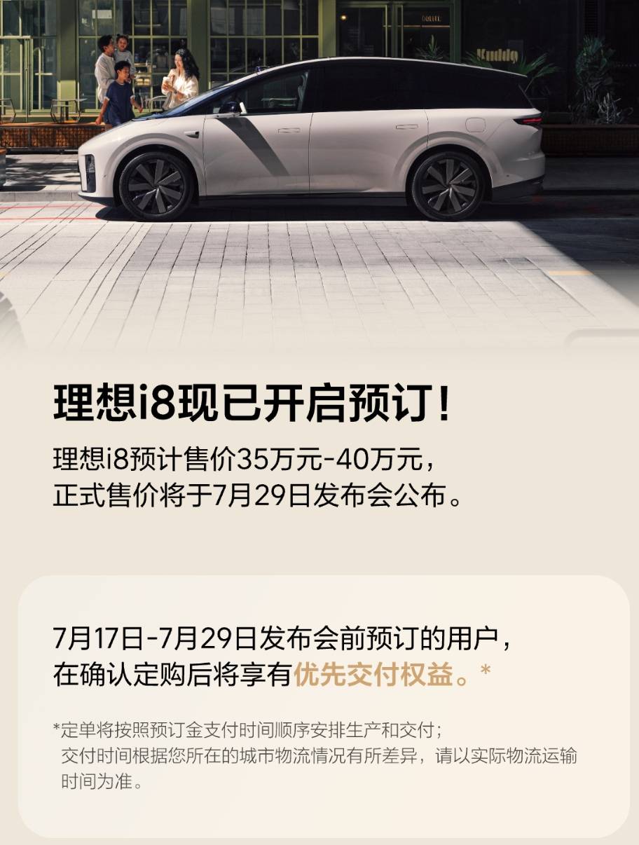 7月17日,理想i8开启预订,新车预计售价35万元-40万元,新车并将于7月29日发布会公布售价。与此同时,7月17日-7月29日发布会前预订的用户,在确认定购后将享有优先交付权益。