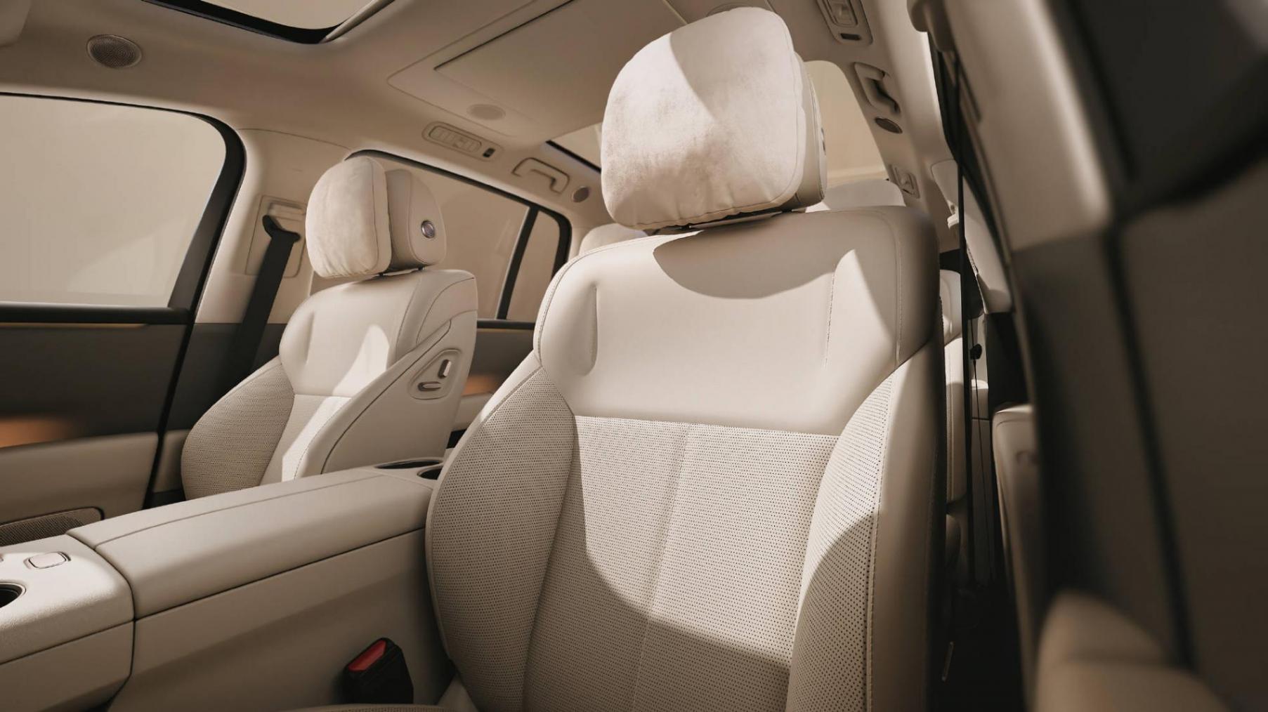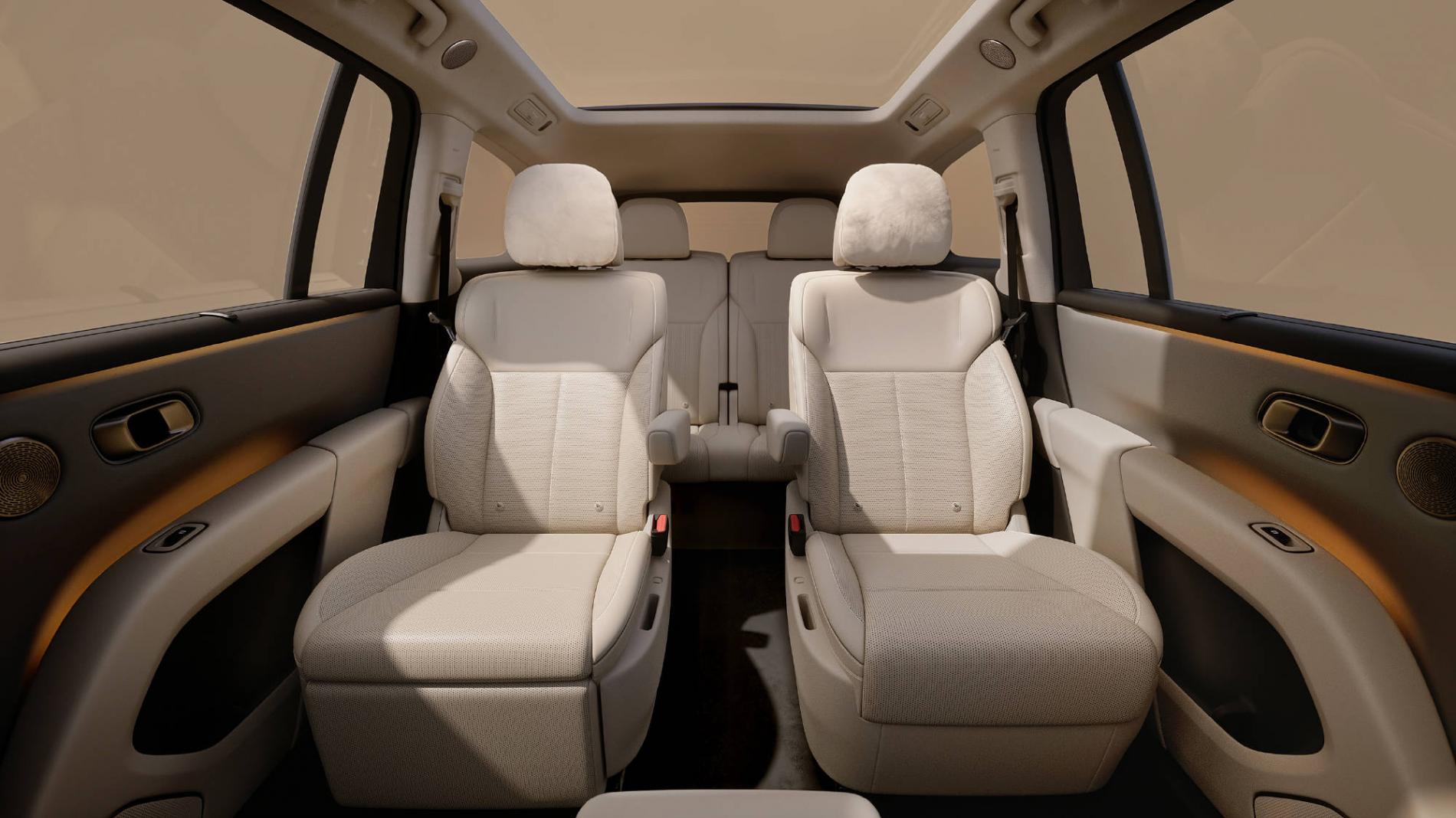 座椅方面,新车采用了2+2+2的六座布局,并且二排还采用了独立座椅,除了支持电动调节、通风加热按摩外,二排右侧座椅还配备零重力座椅。此外,还支持靠背、腿托、坐垫、软枕进行调节和记忆。值得一提的是,新车三排腿部空间为875mm,三排坐高为333mm。同时,新车三排座椅配备三档座椅加热和靠背角度电动调节,左右两侧座椅为分区控制。