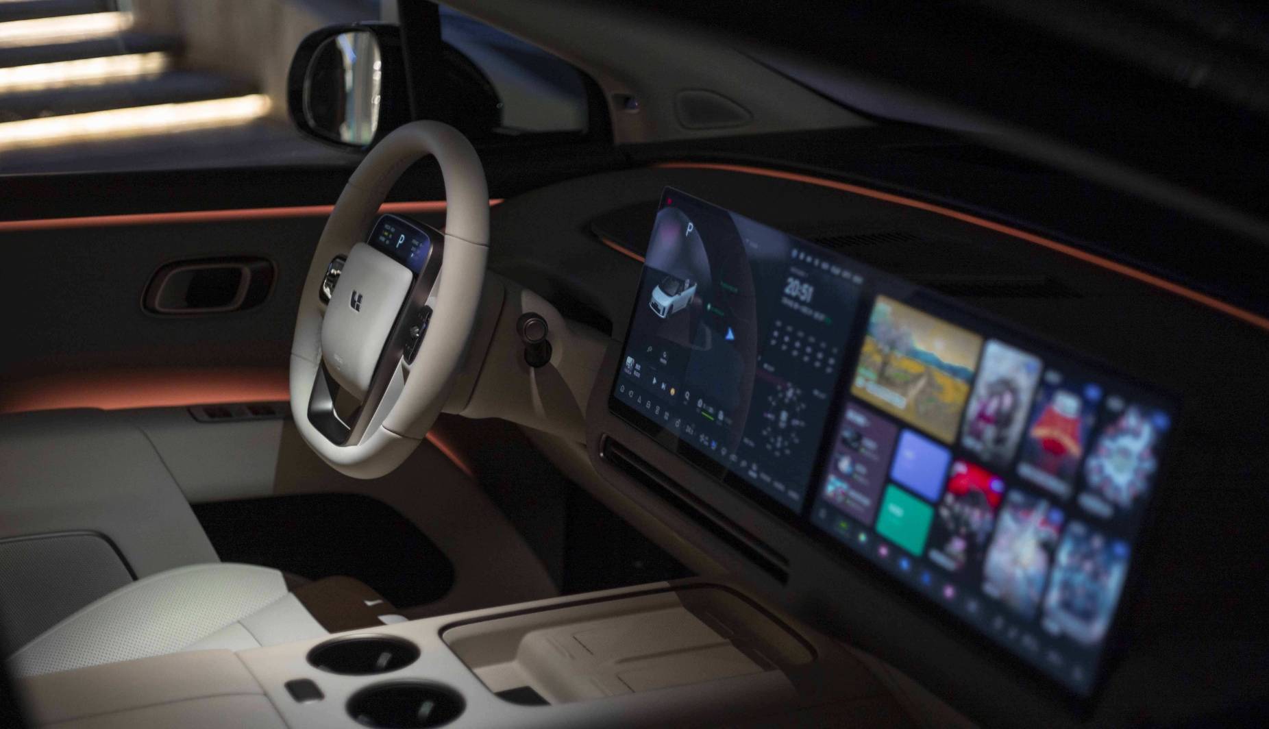 内饰方面,理想i8内饰延续了家族简约、科技的设计风格。浅色的内饰配合环绕式的氛围灯,使其内饰更具温馨。方向盘上的触摸屏、AR-HUD抬头显示、主驾+副驾的双联屏,还是熟悉的味道。此外,新车还在二排配备了21英寸的娱乐屏。