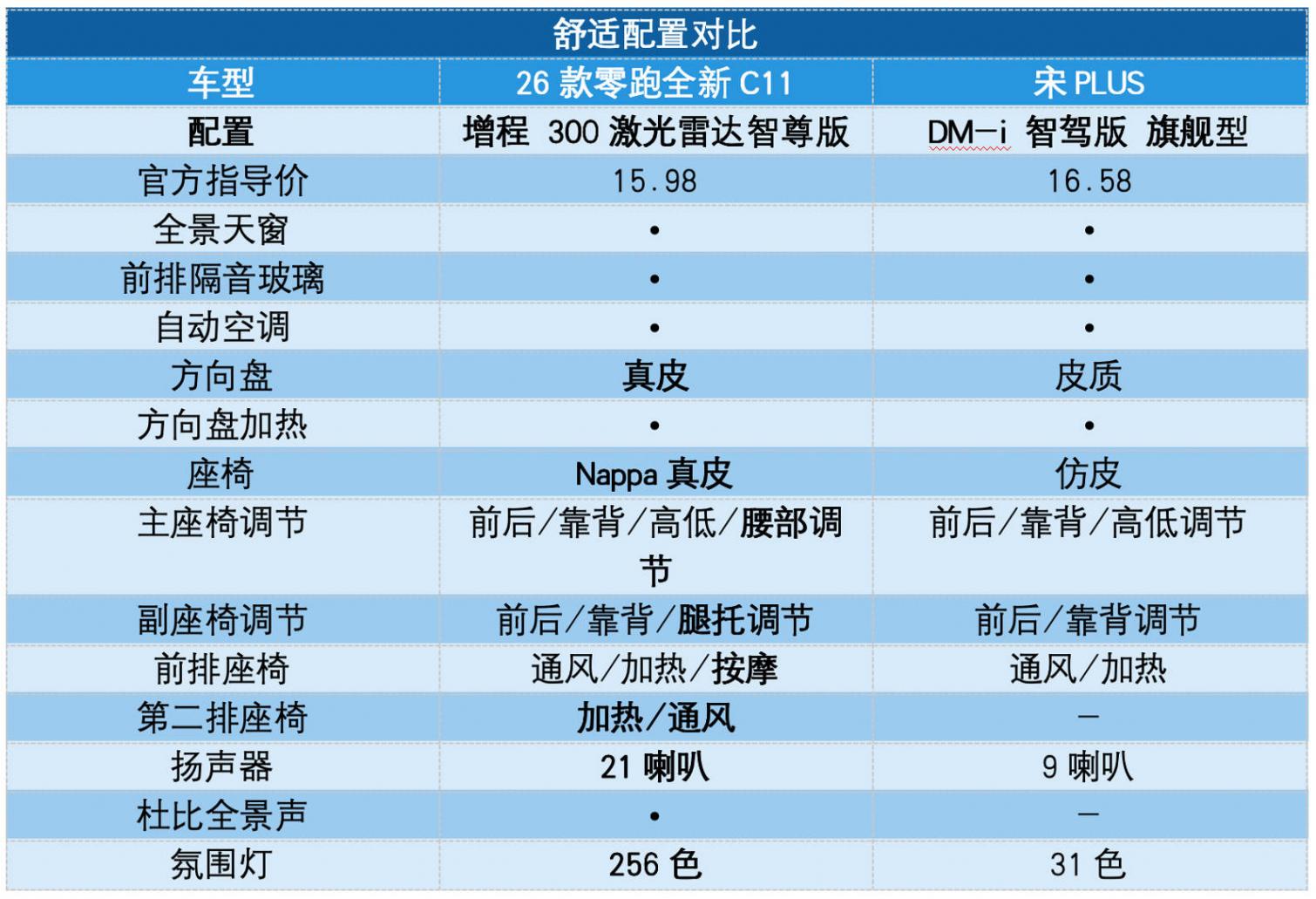 那么,26款的零跑全新C11和宋PLUS各自有哪些优势?谁更值得推荐呢?本文将通过舒适空间、辅助驾驶能力以及行驶表现三个维度解析,话不多说,下面就一起来聊一聊。