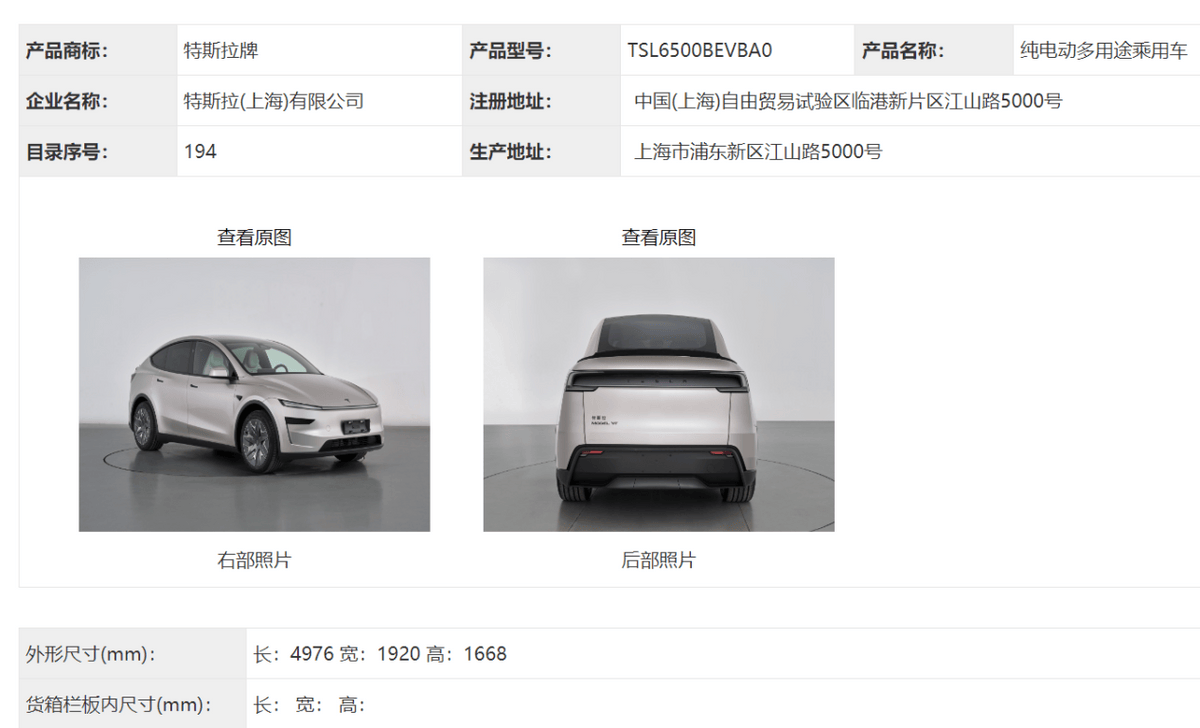 与此同时,新车的“工信部证件照”也曝光了。在最新的《道路机动车辆生产企业及产品公告》(第397批)公示清单中,Model Y L的信息也曝光了,产品型号是TSL6500BEVBA0,三排六座布局,车身长度接近5米。毫无疑问,这是一款比Model X更大的车型。至于是不是中国“特供”,特斯拉方面倒是三缄其口。
