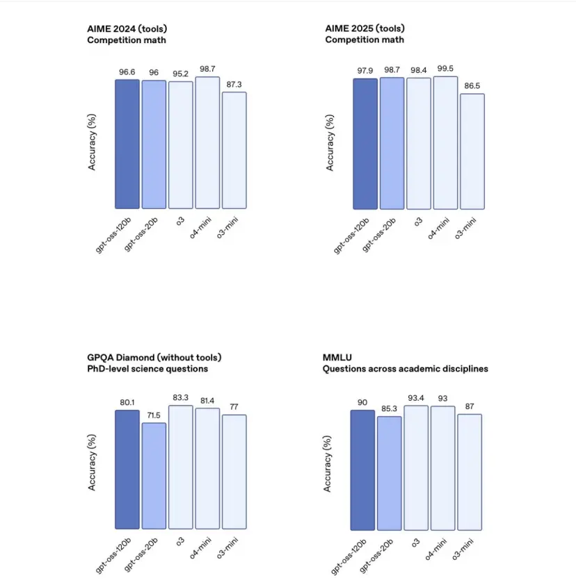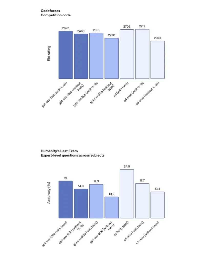 gpt-oss-120b模型在核心推理基准测试中实现了与 OpenAI o4-mini 接近的性能,可以在单张80 GB GPU 上高效运行。gpt-oss-20b 在常见基准测试中能达到与 OpenAI o3-mini 类似的性能,可以在仅具有 16 GB 内存的端侧运行。