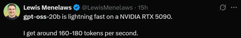 在RTX5090上运行20B的版本,每秒能达到160-180tokens的输出速度。
