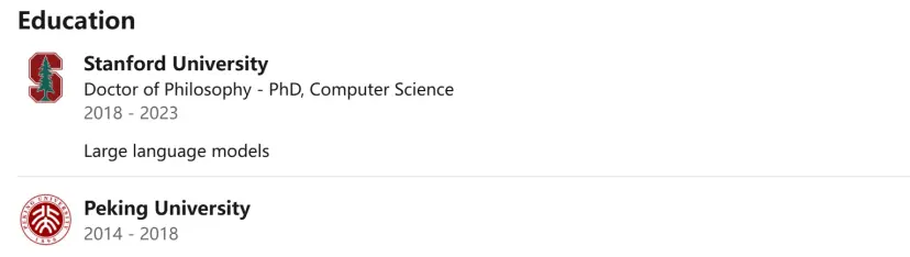在去OpenAI之前,他曾经在苹果,微软,谷歌,英伟达都工作或者实习过。2018年从北大本科毕业后,他在斯坦福大学获得了计算机博士学位。