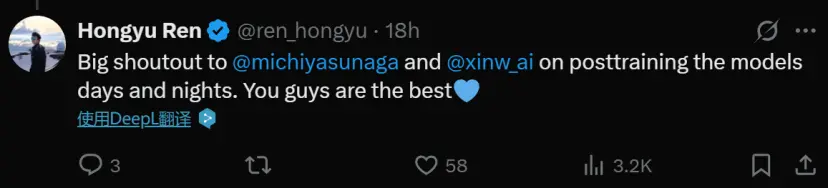 而在社交网络上,他也专门感谢了另一位华人科学家Wang Xin在项目后训练阶段的贡献。