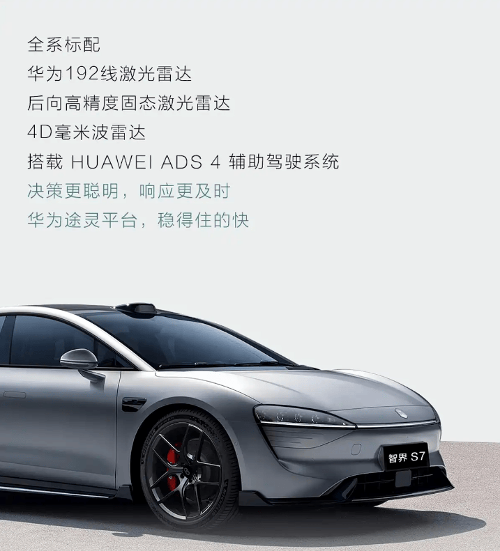 新款智界R7和新款智界S7在外观方面均换装全新品牌LOGO,新款智界R7针对前灯组下装饰件进行了升级,下方两侧导流槽细节进行调整,取消了现款的纹路造型,整体更加协调,此外,新车还配备后视镜麦克风。两款新车还将提供极光绿外观颜色,全系标配华为192线激光雷达、后向高精度固态激光雷达以及4D毫米波雷达,并搭载HUAWEI ADS 4辅助驾驶系统。