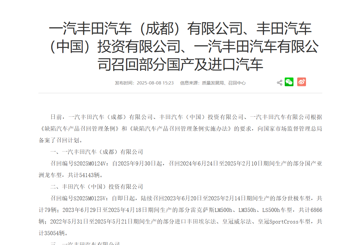 8月8日,国家市场监督管理总局官网连续发布多条公告,一汽丰田汽车(成都)有限公司、丰田汽车(中国)投资有限公司及一汽丰田汽车有限公司正式备案大规模召回计划。此次召回涉及亚洲龙、雷克萨斯LM/LS系列、进口埃尔法等多款热销车型,总量高达96,157辆,其中仅亚洲龙单一车型就占召回总量的56%以上。