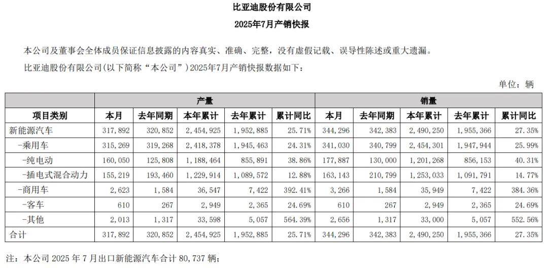 7月总销量344296辆,同比增长0.56%;1-7月累计销量2490250辆,同比增长27.35%,持续稳固新能源销冠地位,也是国内唯一过30万辆的车企。
