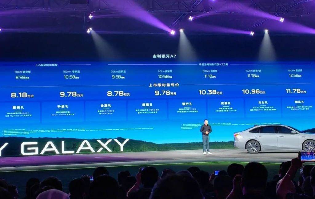 作为“电混家轿颠覆者”的吉利银河A7基于GEA全球智能新能源架构打造,于8月8日正式上市,共推出7款车型,售价区间为8.98-12.58万元,限时指导价8.18-11.78万元,较原价直降8000元,更比秦L DM-i的起售价低1.8万元。这一颠覆性定价策略不仅击穿了混动家轿长期固守的10万元心理防线,更将B+级混动轿车的门槛拉至燃油A级车区间(如轩逸、朗逸),形成跨维度竞争。