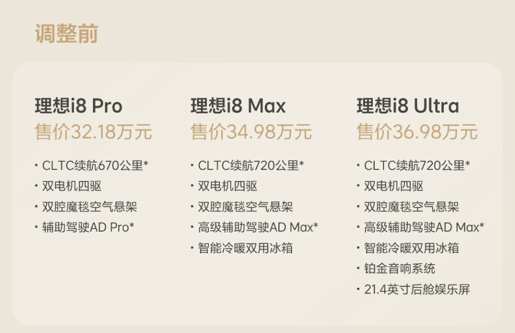 8月5日,理想汽车官宣:理想i8 决定统一配置版本,以理想i8 Max作为标准配置,价格调整为33.98万元。
