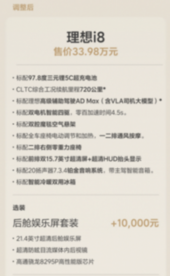 调整后的理想i8标配97.8度三元锂5C超充电池、高级辅助驾驶AD Max、智能冷暖冰箱、铂金音响系统等配置,主打“增配不增价”,后舱娱乐屏套装则转为选装,价值感更突出。