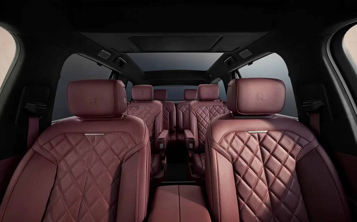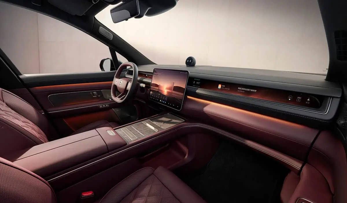 同时,整体内饰风格向ET9看齐,整体采用酒红色配色,同时加入了环绕式氛围灯。配置上,包括Skyline天际线屏幕、悬浮式中控屏以及最新的NOMI系统都将得到延续。