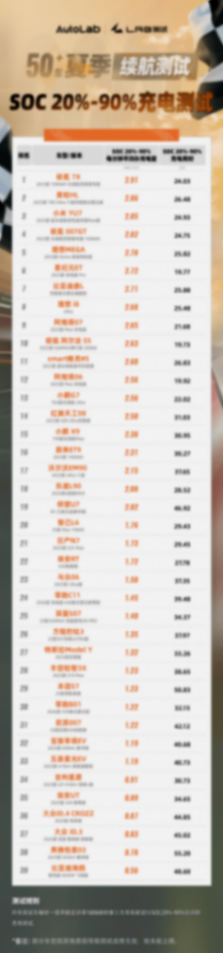 此外榜单中只展示了39款车型,部分车型未上榜的原因是充电测试过程中存在其他情况干扰,比如误被其他车分流等情况,经过我们核对后为保证测试公平性,所以就未能统计在内,这里也向大家说声抱歉。