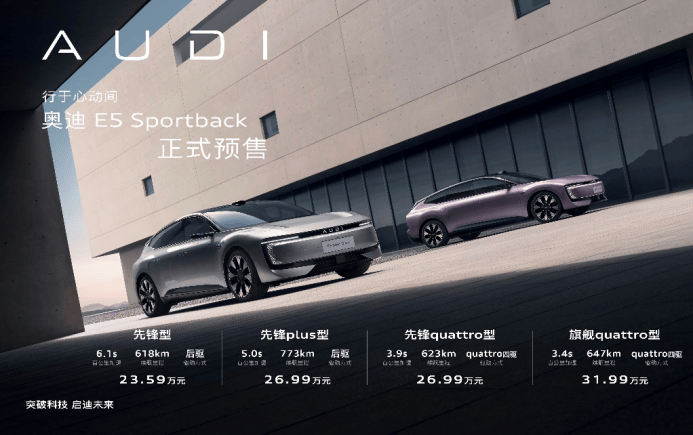 8月18日,奥迪E5 Sportback正式开启预售。全系推出先锋型、先锋plus型、先锋quattro型和旗舰quattro型共4款配置车型,限时23.59万元起。