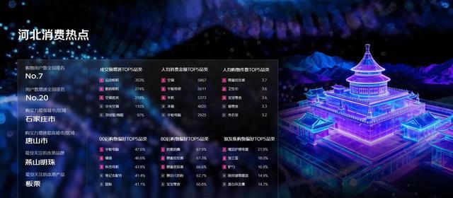 河北不同年龄的消费者消费偏好各有不同。00后喜欢追逐硬核科技产品,群体购物偏好TOP5品类分别为平板电脑、键盘、有线耳机、笔记本配件、鼠标;80后的宝爸宝妈们为宝宝消费必不可少,其购物偏好TOP5品类是奶瓶奶嘴、婴童拉拉裤、婴童纸尿裤、婴幼儿奶粉、宝宝零食;银发族也从不落于时代发展,关注吃喝与形象,潮流护理电器、加工蛋、铲勺、厨房储物器皿、盖白染发膏是银发族的购物偏好TOP5品类,其中,潮流护理电器包括肩颈按摩仪、足部按摩仪等产品。