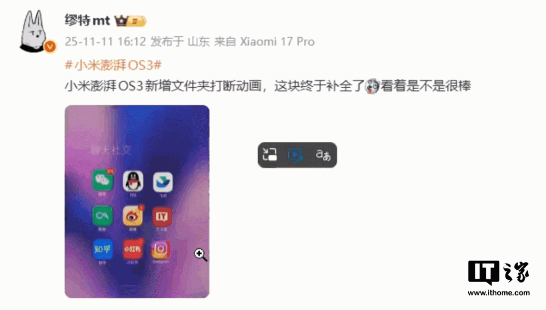 11 月 11 日消息,博主 @缪特mt 今日分享,称小米澎湃 OS 3 系统新增了文件夹打断动画。